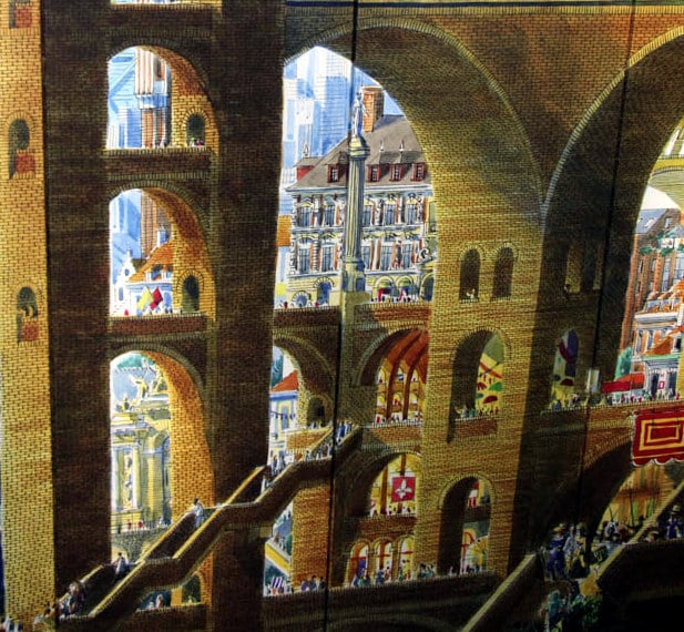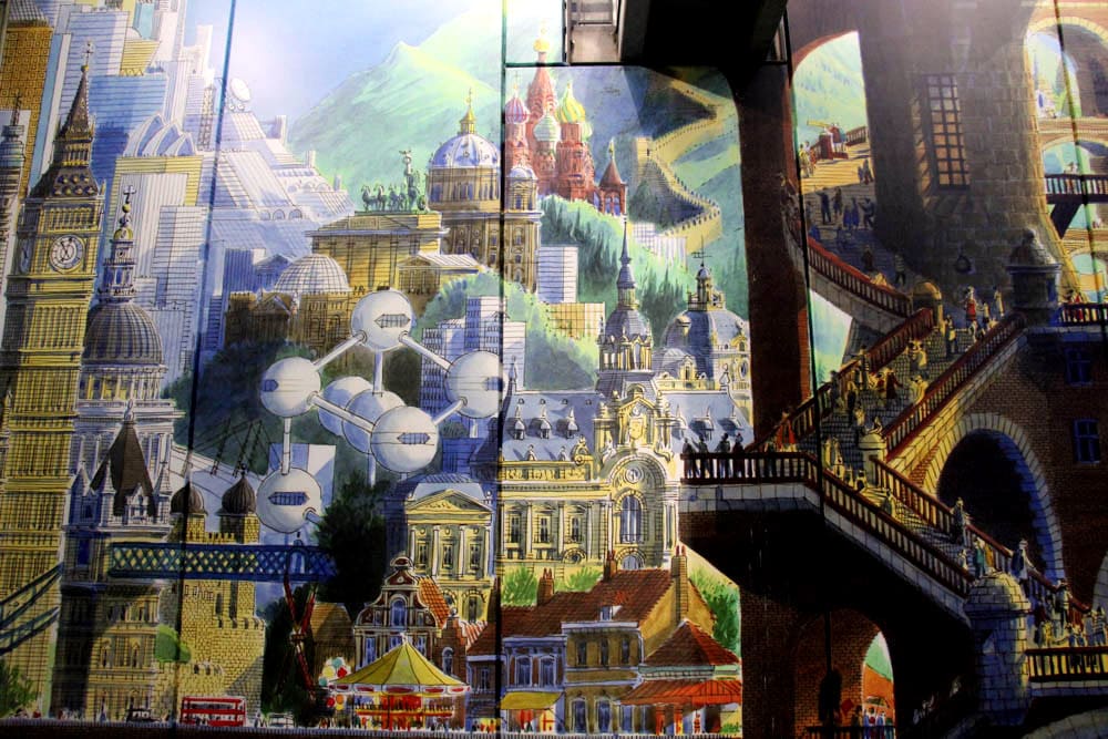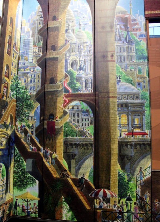 La fresque, c’est le monde qui vous enveloppe ! Au milieu des structures piranésiennes, avec ses passerelles vertigineuses, ses escaliers suspendus, ses perspectives infinies, Jean a essayé d’y faire rentrer le plus de références possibles, dans un joyeux mélange, une immense tour de Babel ! A chacun ensuite de les retrouver.