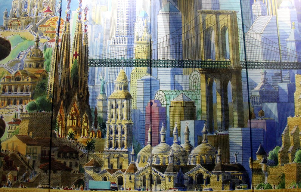 La conception a duré un an. Jean s’est inspiré des villes où nous avons voyagé, et où il a fait des expositions. Il a d’abord réalisé des esquisses (environ 90 aquarelles) ; puis les originaux : plusieurs centaines de panneaux à l’échelle de la fresque, qui ont ensuite été scannés et raboutés pour faire des bâches très longues. Comme les panneaux étaient à l’échelle, il n’y a pas eu de perte de qualité au moment du scannage. A l’époque, c’était très innovant, et il n’y avait qu’une entreprise de Seine-Saint-Denis qui savait faire ça.